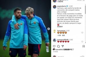 罗贝托晒出效力巴萨时期与阿尔巴的合照,并写道:“兄弟,能认识你并与你共度这么多岁月,我何其幸运!”